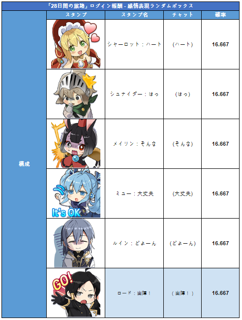 ※ 28日目のログインを達成してスタンプランダムボックスを獲得できます。