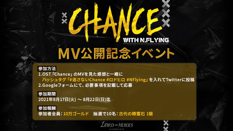 ロードオブヒーローズ公式YouTubeに投稿された、「Chance」のミュージックビデオはご覧いただけましたか?まだの方は今すぐチェックしてください。さらに、「Chance」 のミュージックビデオの公開を記念してイベントを開催。皆様のご参加をお待ちしております。