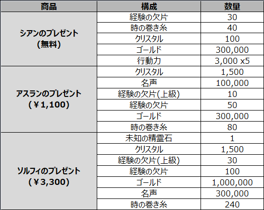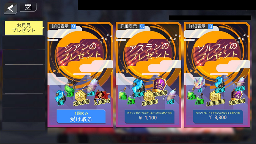 ※ シアン-> アスラン -> ソルフィ順にお月見プレゼントを購入できます。