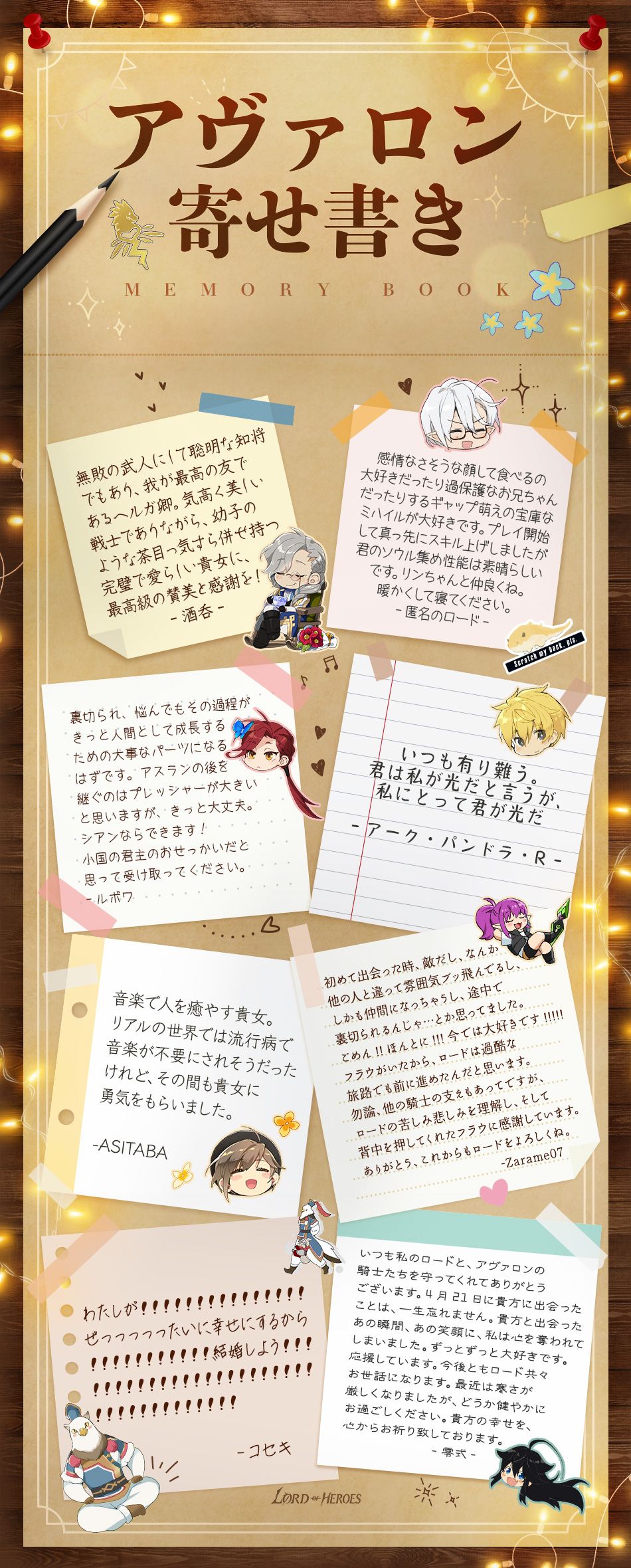 皆様が真心を込めて書いてくださったメッセージは、アヴァロンの英雄たちに届きました! 英雄たちも皆一緒に口をそろえてこのように答えていました。