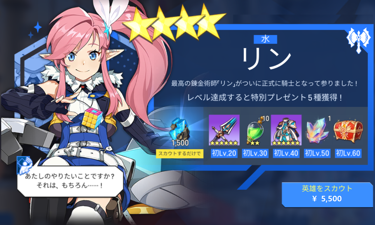 - 販売内容:英雄【水】リンと、レベル達成による特別プレゼントが入ったパック