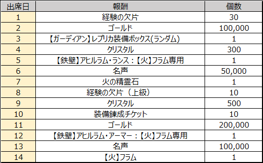 ※5日目の報酬【鉄壁】アヒルラム・ランス及び12日目報酬【鉄壁】アヒルラム・アーマーは【火】フラム専用で支給されます。