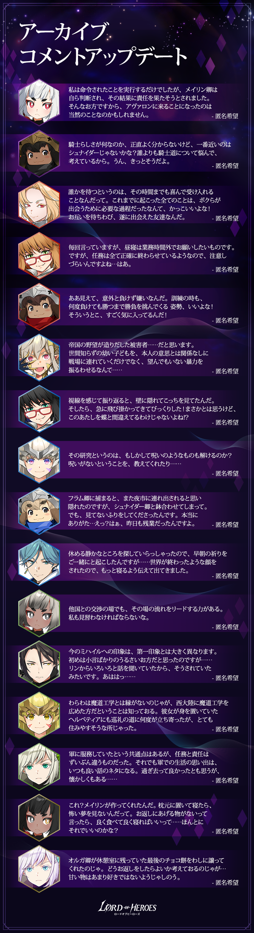 - アーカイブに以下の英雄たちのコメントが追加されます。