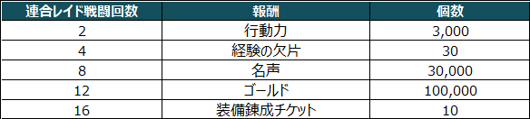 - イベント内容:イベント期間中、連合レイドのプレイ回数に応じて報酬を獲得できます。