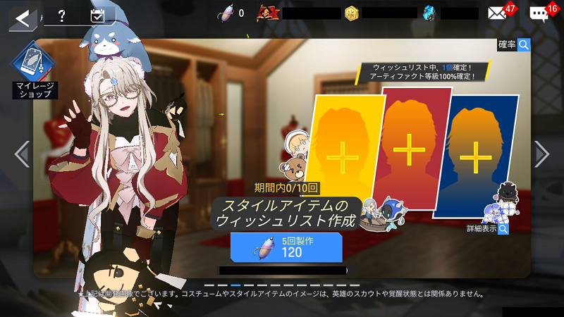 - ウィッシュリストに欲しい3名の英雄を登録でき、時の巻き糸120個を使って5個のスタイルアイテムを製作できます。