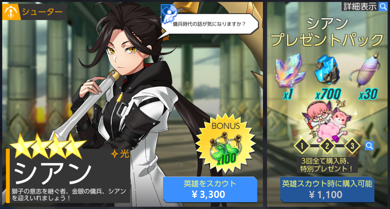 - 【光】シアンは新しく登場する英雄パックを購入してスカウトできます。