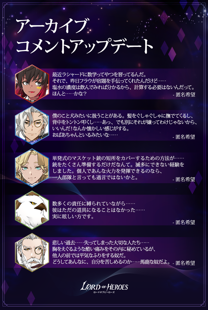 - アーカイブに以下の英雄たちのコメントが追加されます。