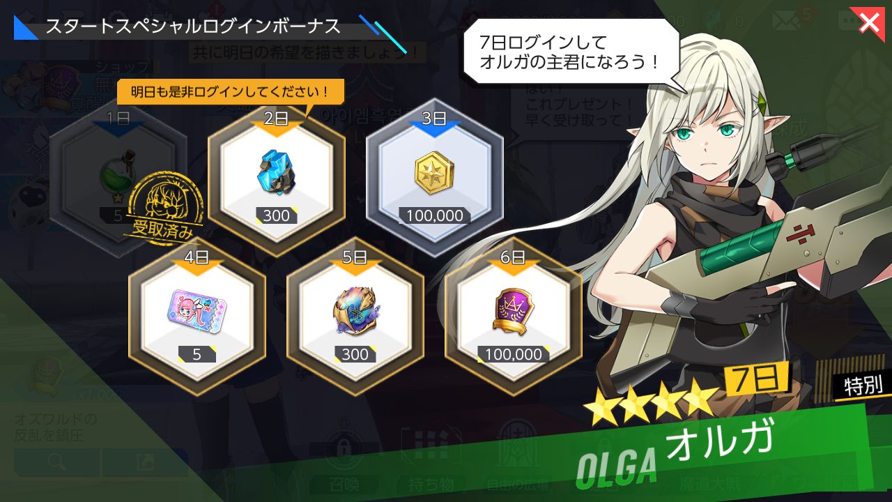 - スタートスペシャルログインボーナスは、ノーマル難易度「ニーベルンゲン大森林1-2」クリア後にロビー画面で確認できます。