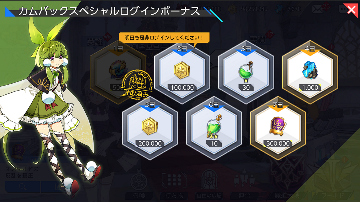 - 「カムバックスペシャルログインボーナス」は、アプリの未接続期間が連続30日以上続いたアカウントが対象です。復帰後、初アクセス時に報酬を受け取ることができます。