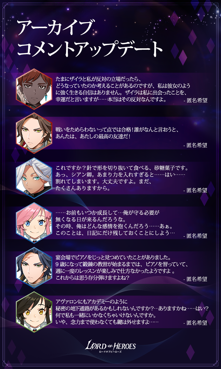 - アーカイブに以下の英雄たちのコメントが追加されます。
