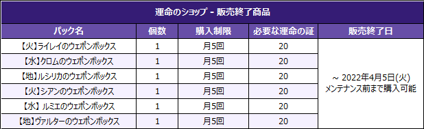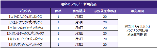 - 販売期間:2022年4月5日(火)メンテナンス後~別途案内時 迄