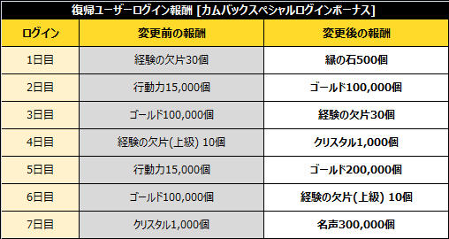 - 復帰したロードに贈る7日間のログイン報酬「カムバックスペシャルログインボーナス」を変更します。
