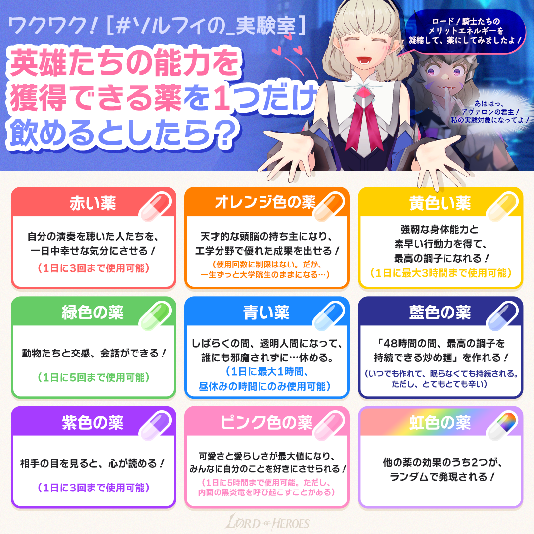 ドキドキ!ついに、英雄たちが持つ「メリットエネルギー」を凝縮して薬にすることに成功したソルフィ!