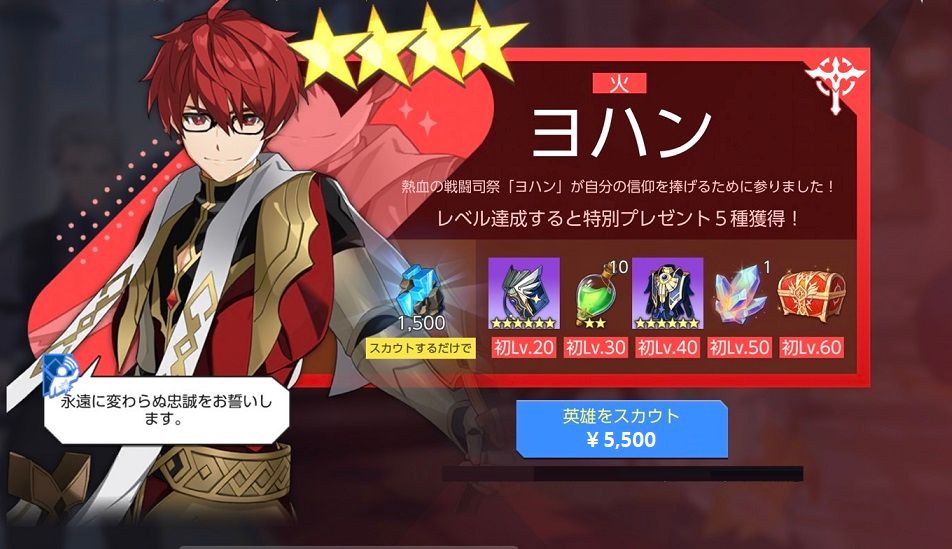 - 販売内容:英雄【火】ヨハンと、レベル達成による特別プレゼントが入ったパック