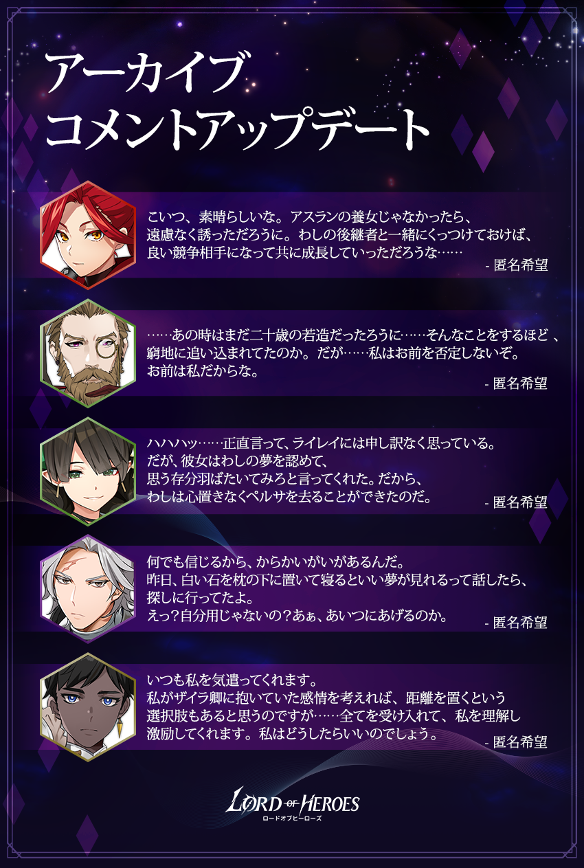 - アーカイブに以下の英雄たちのコメントが追加されます。