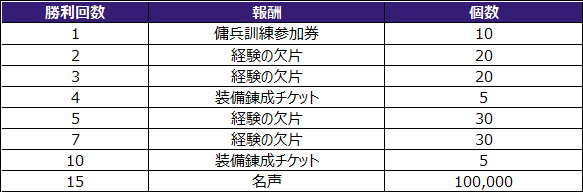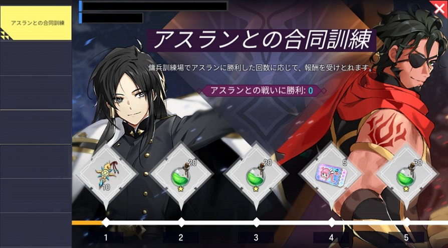 - イベント内容:イベント期間中、傭兵訓練場でアスランに勝利した回数に応じて報酬を獲得できます。