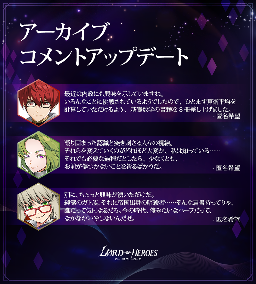 - アーカイブに以下の英雄たちのコメントが追加されます。