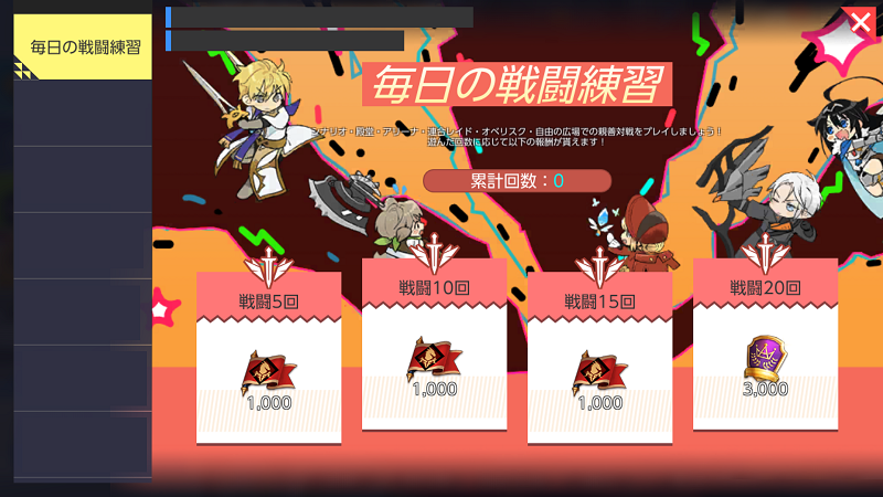 - シナリオ/殿堂/アリーナ/連合レイド/オベリスク/自由の広場での親善対戦プレイの回数に応じて報酬を獲得できます。