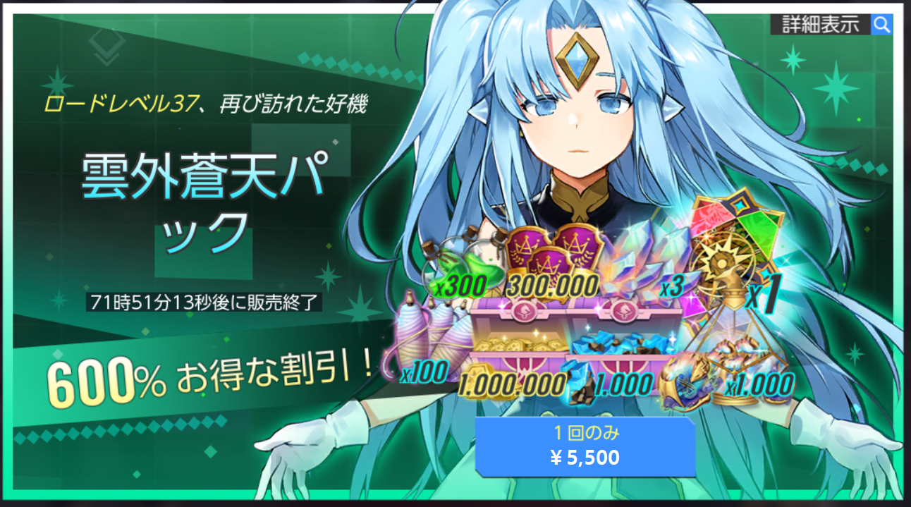※「雲外蒼天パック」は、対象レベル到達後、72時間購入ウインドウが表示されます。なお、時間内に購入しなかった場合は、次のロードレベル上昇時に再度パッケージ購入ウインドウが表示されます。