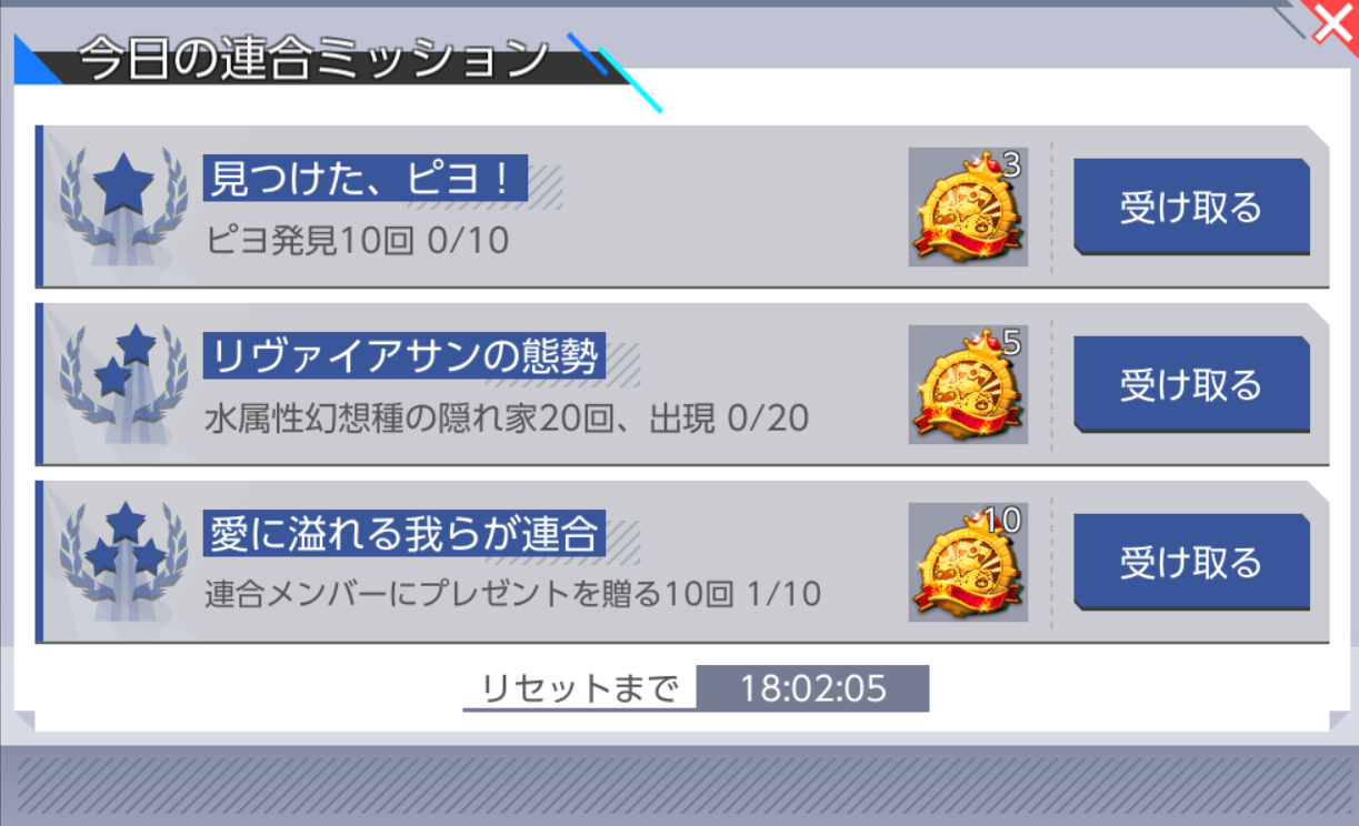 - 「今日の連合ミッション」達成時、「受け取り」アイコンをタップすると報酬を受け取ることができます。受け取った報酬はプレゼントボックスに送られます。
