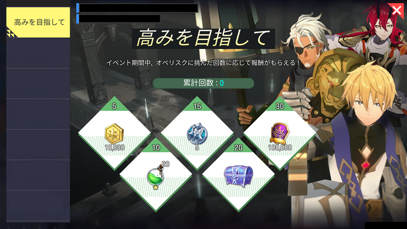 - イベント内容:イベント期間中、オベリスクに挑んだ回数に応じて報酬を獲得できます。