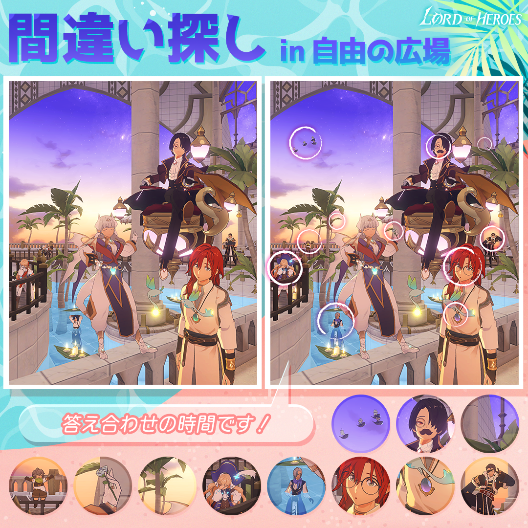 ユニバース 【正解発表】間違い探し in 自由の広場 「ロードオブヒーローズ」運営チーム Read more posts by this author. 「ロードオブヒーローズ」運営チーム 2022年 8月 10日 水曜日 間違い探しの正解を発表します!皆さんは、間違いの箇所を全て見つけられましたか?まだまだ暑い日が続きますが、ロードオブヒーローズとともに、涼しい夏をお過ごしください!