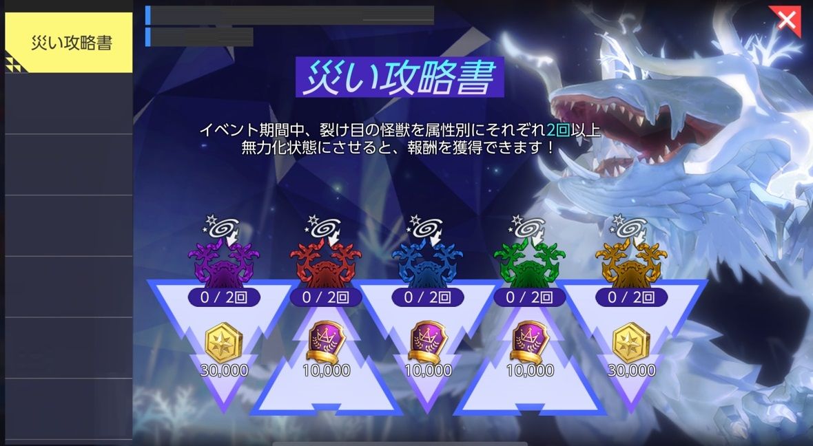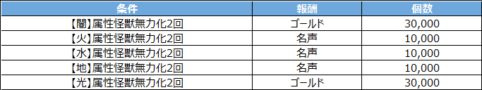 - イベント内容:イベント期間中に各属性の怪獣を2回以上無力化状態にすると報酬を獲得できます。