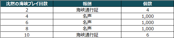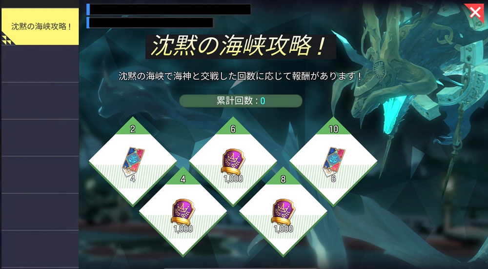- イベント内容:イベント期間中、沈黙の海峡で海神と戦闘した回数に応じて報酬を獲得できます。