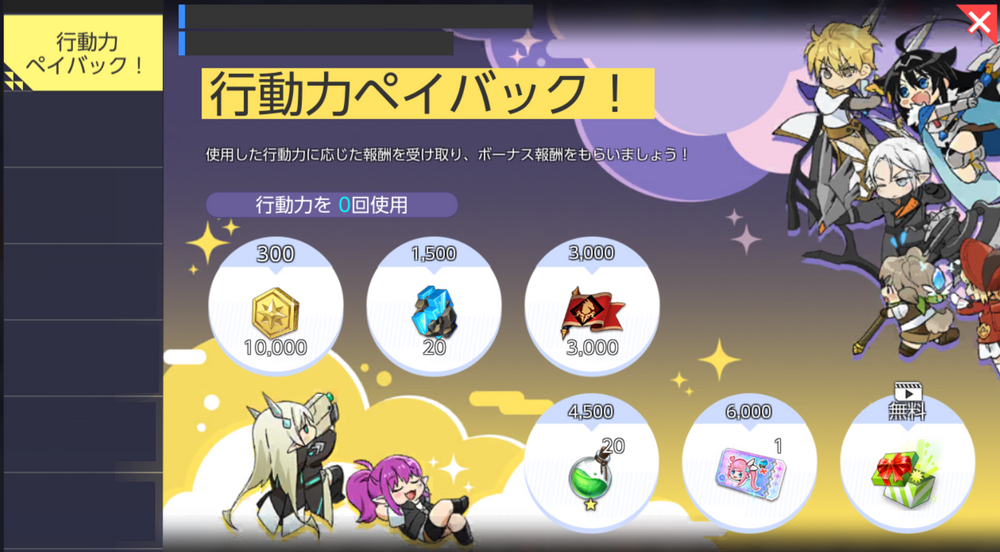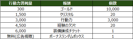 - イベント内容:消費した行動力に応じて報酬を獲得できます。