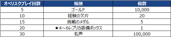 - イベント内容:イベント期間中、オベリスクに挑んだ回数に応じて報酬を獲得できます。
