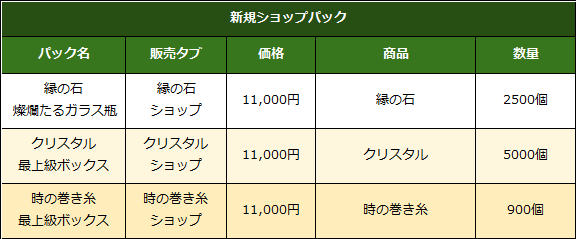 - 縁の石ショップ/ 時の巻き糸ショップ / クリスタルショップに新しくパックが各1種ずつ追加されます。