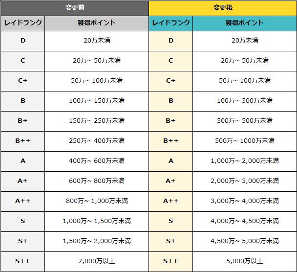 ※変更されたレイドランクと獲得ポイントは以下の通りです。
