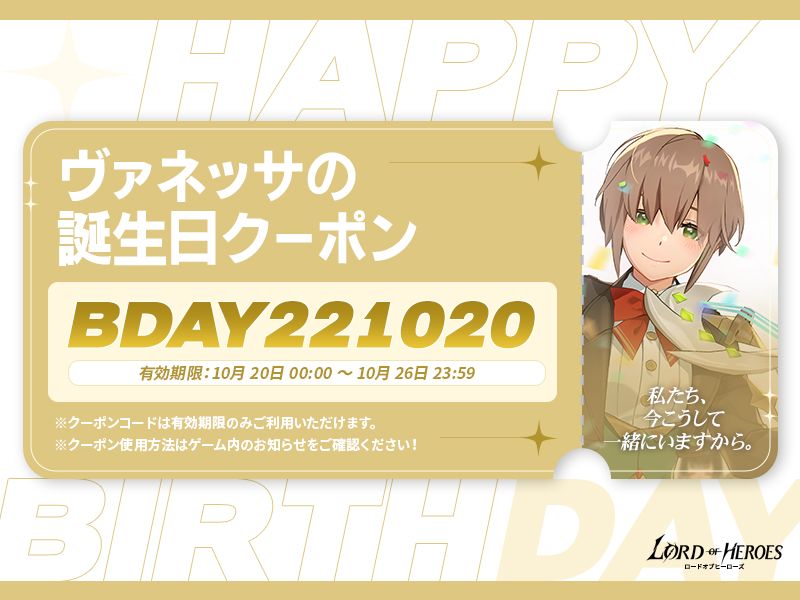 10月20日はヴァネッサの誕生日です!「誕生日クーポン」と「壁紙」🙊 そして、アプリ内でしか見ることができない記念ローディングイメージまで準備しました!💘