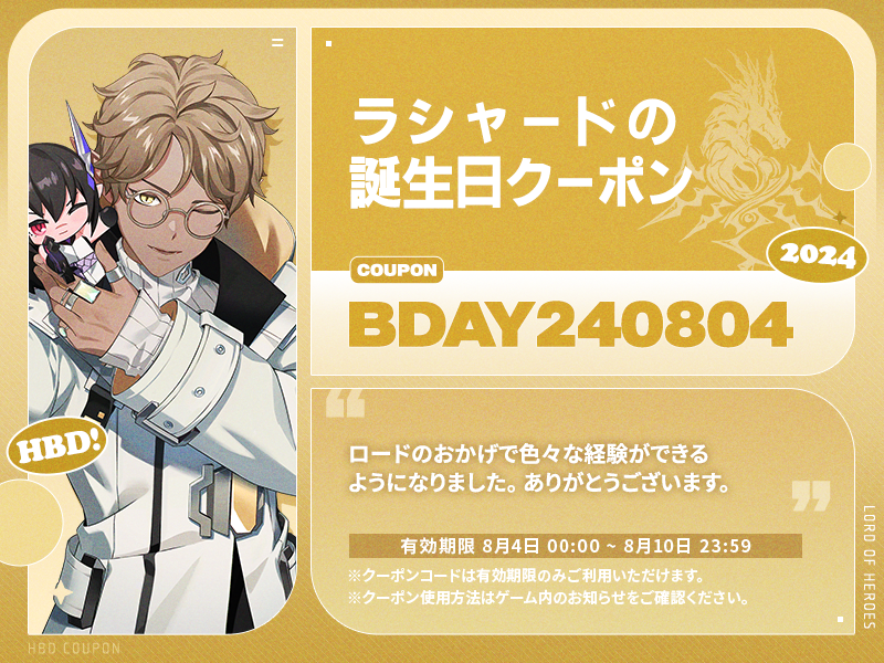 ラシャードの誕生日を迎え、バースデークーポンを用意しました。
