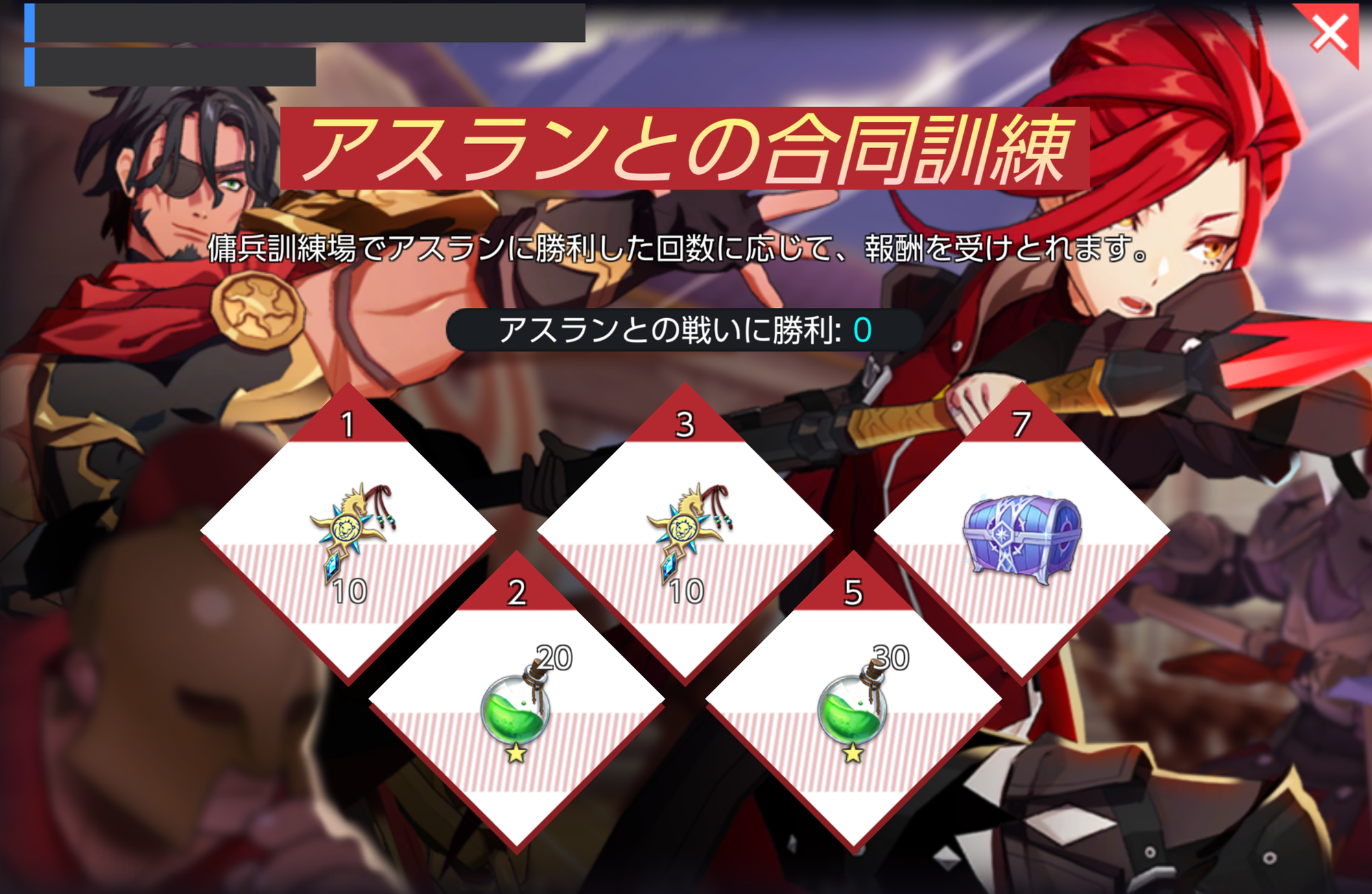 - 傭兵訓練場でアスランに勝利した回数に応じて報酬がもらえます!