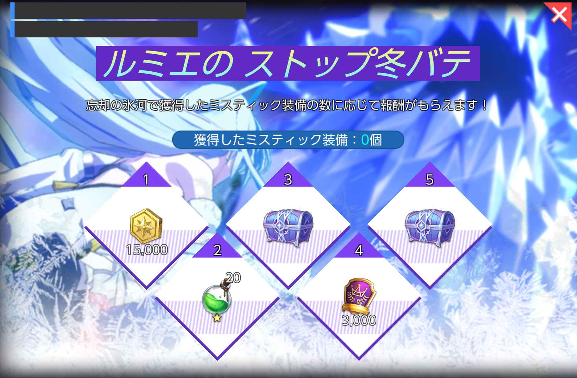 - 忘却の氷河で獲得したミスティック装備の数に応じて報酬がもらえます!
