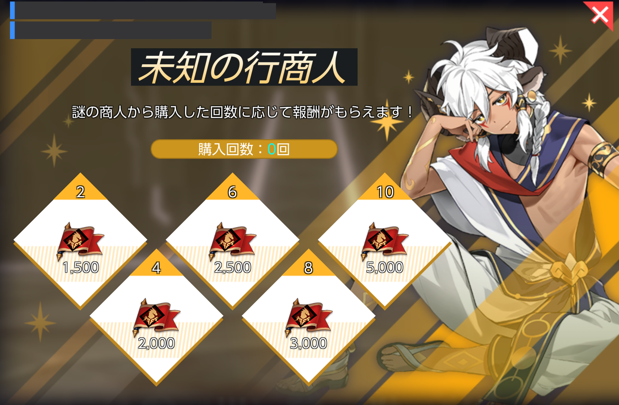 - 謎の商人から購入した回数に応じて報酬がもらえます!
