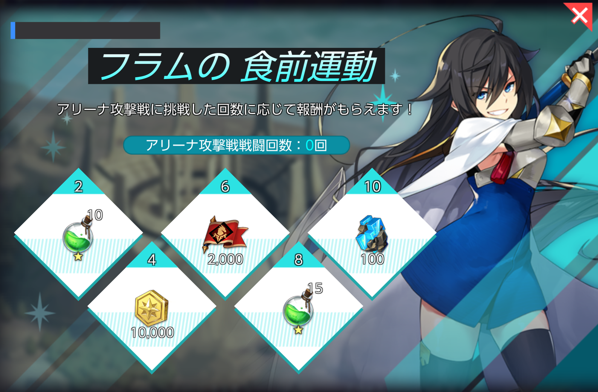 - アリーナ攻撃戦に挑戦した回数に応じて報酬がもらえます!
