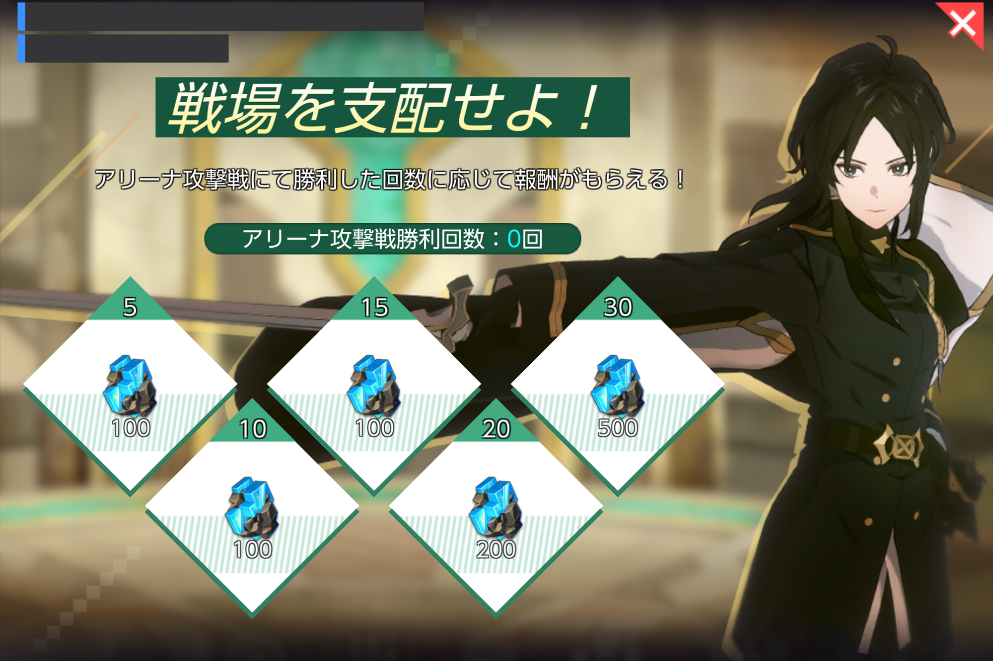 - アリーナ攻撃戦にて勝利した回数に応じて報酬がもらえます!