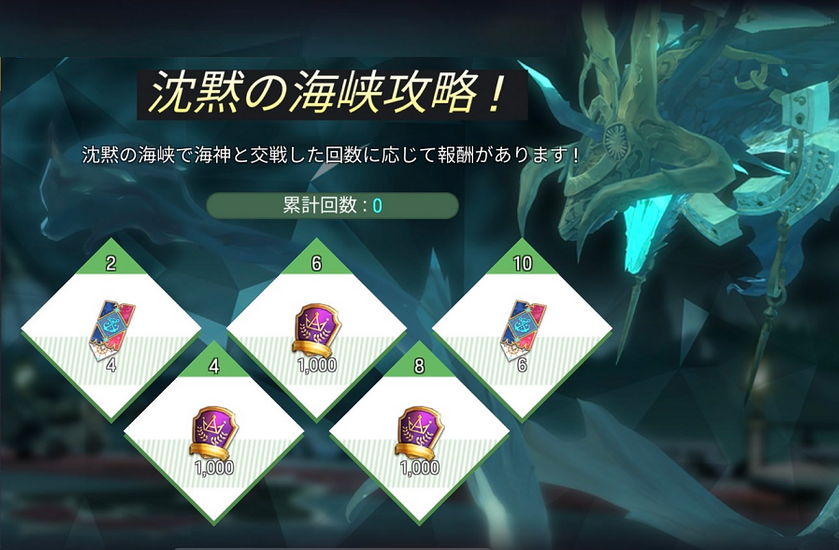 - 沈黙の海峡で海神と交戦した回数に応じて報酬がもらえます!