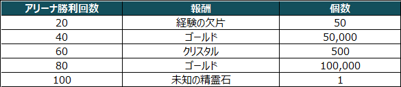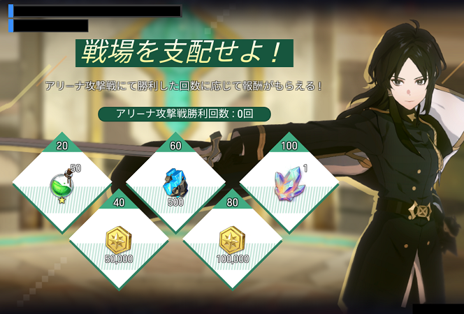 - イベント期間中、アリーナ攻撃戦で勝利した回数に応じて報酬を獲得できます。