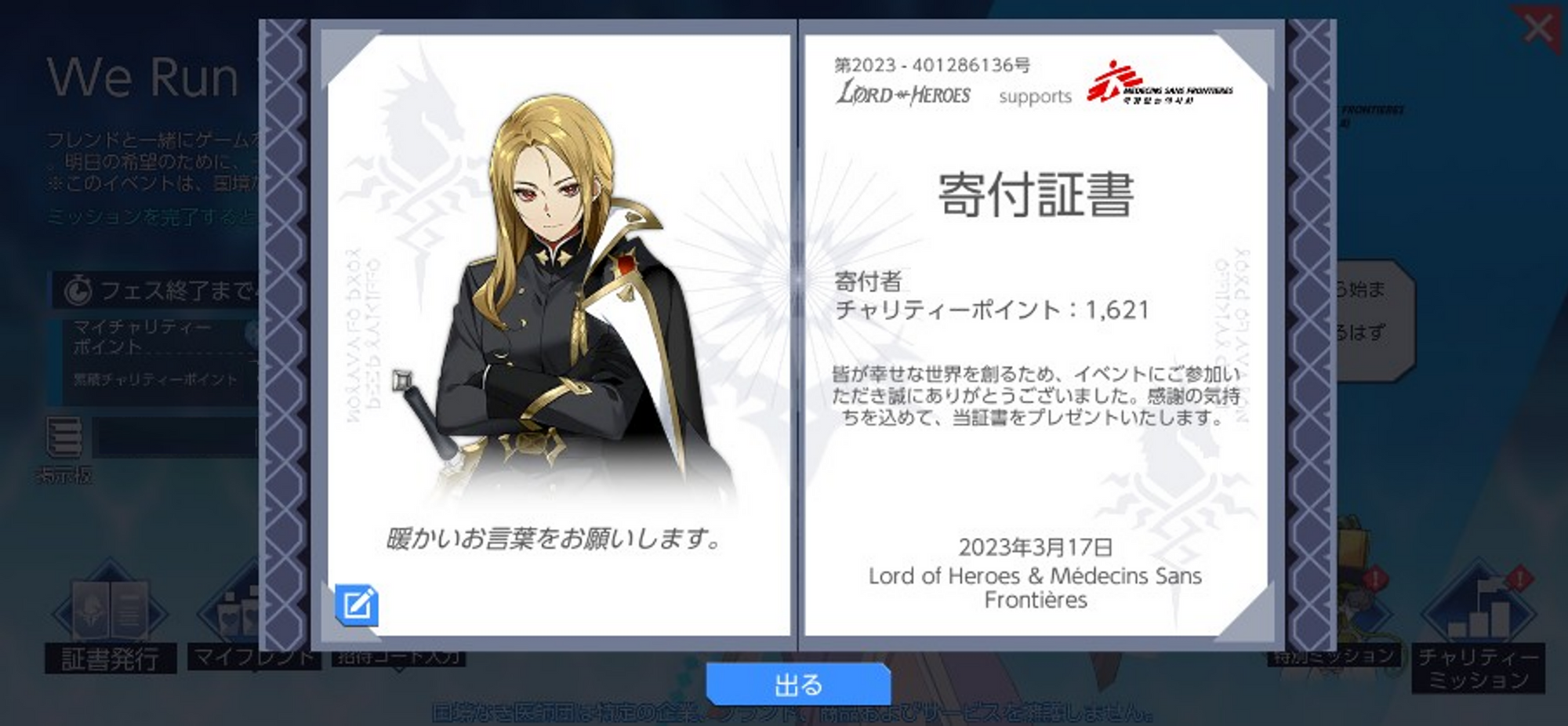 - ミハイルと会話をすると、行動力3,000個/経験の破片10個/ゴールド10,000個/1,000名声のうち1種を獲得できます。