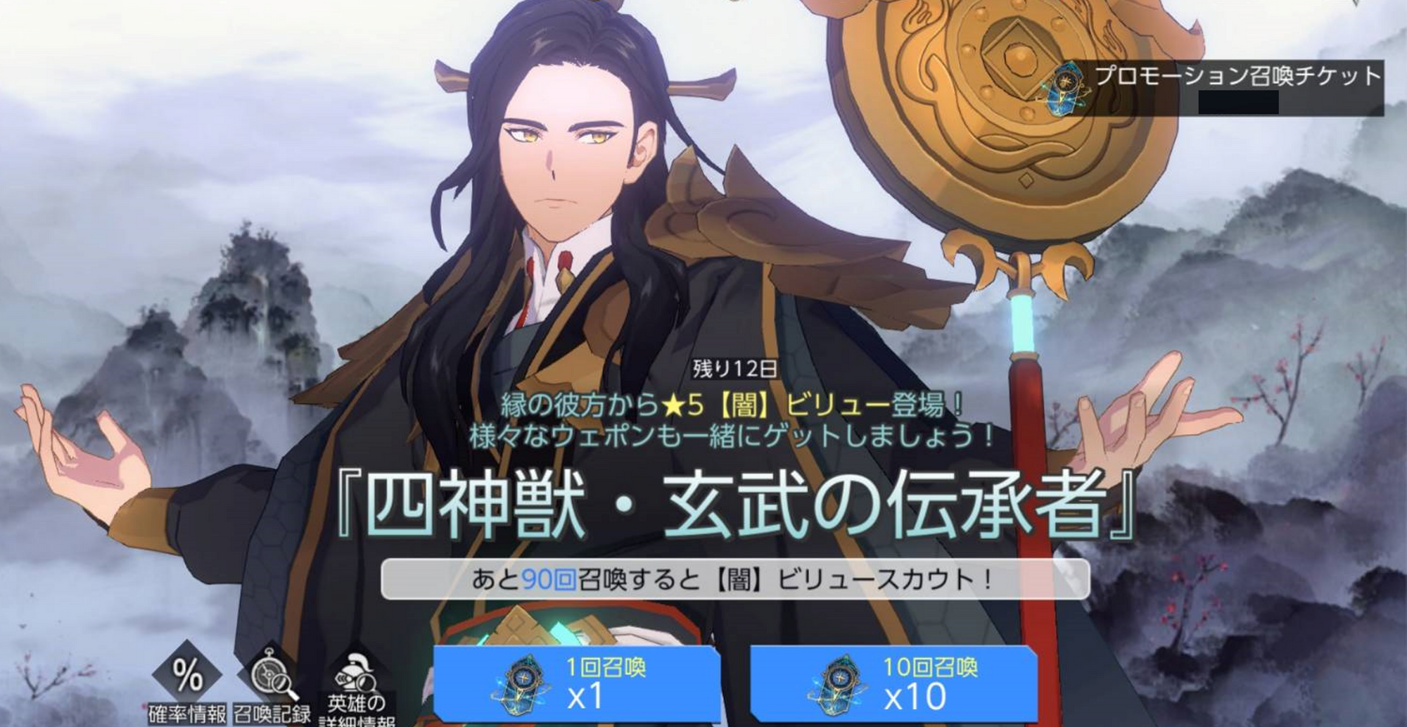 ※ 「四神獣・玄武の伝承者」召喚で89回以上★5【闇】ビリューが登場しない場合、90回目の召喚で★5【闇】ビリューを100%の確率で召喚されます。