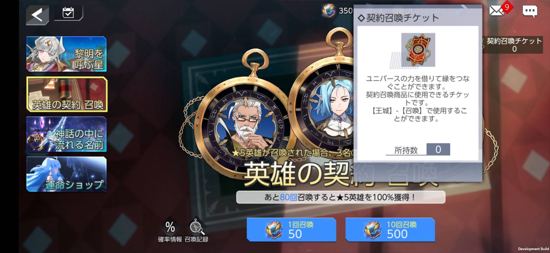 - 王城の右下の「召喚」-「英雄の契約 召喚」から契約召喚チケットを使用することができます。