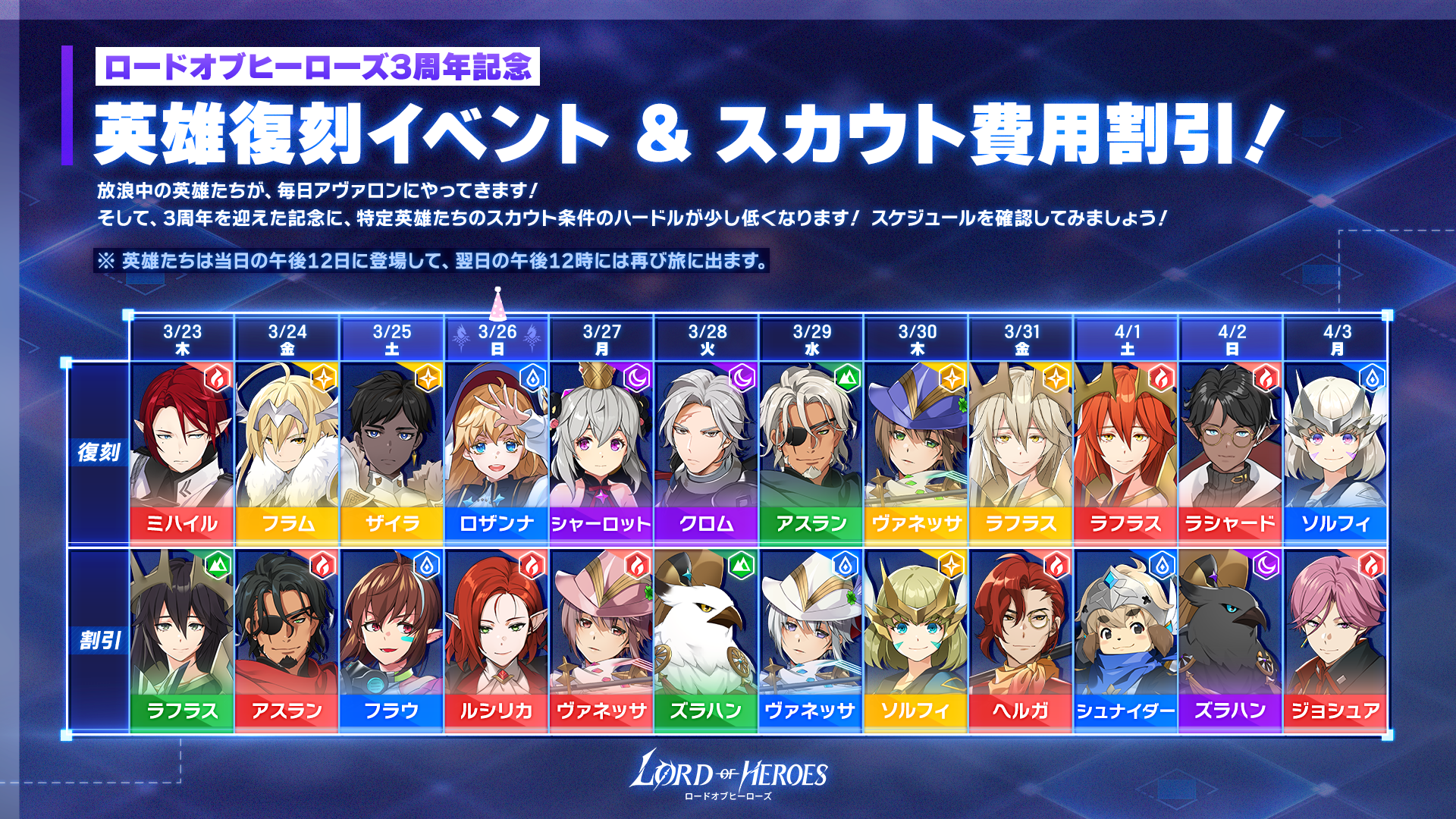 3周年を記念して放浪中の英雄たちが戻ってきました!英雄スカウトのチャンスをお見逃しなく!