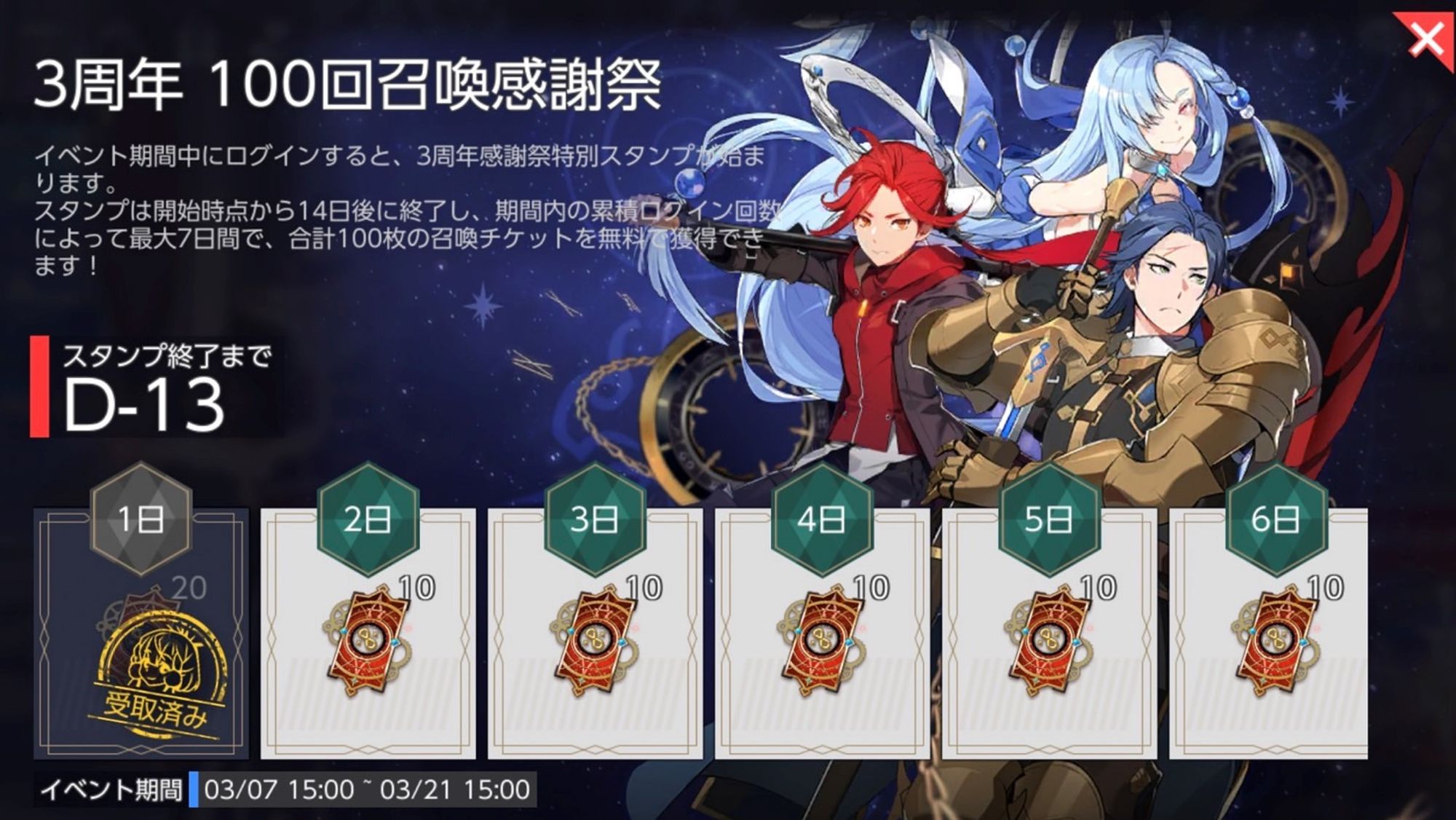 ■ 累積ログインイベント:3周年記念100回召喚感謝祭