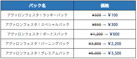 ※アヴァロンフェスタパックは1~5段階まで構成されており、前段階のパッケージを購入しなければ次の段階を購入できません。(例:2段階購入⇒3段階購入可能)