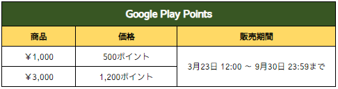 - 3月23日(木) 12:00 ~ 9月30日(土) 23:59までGoogle Play Points商品が追加されます。