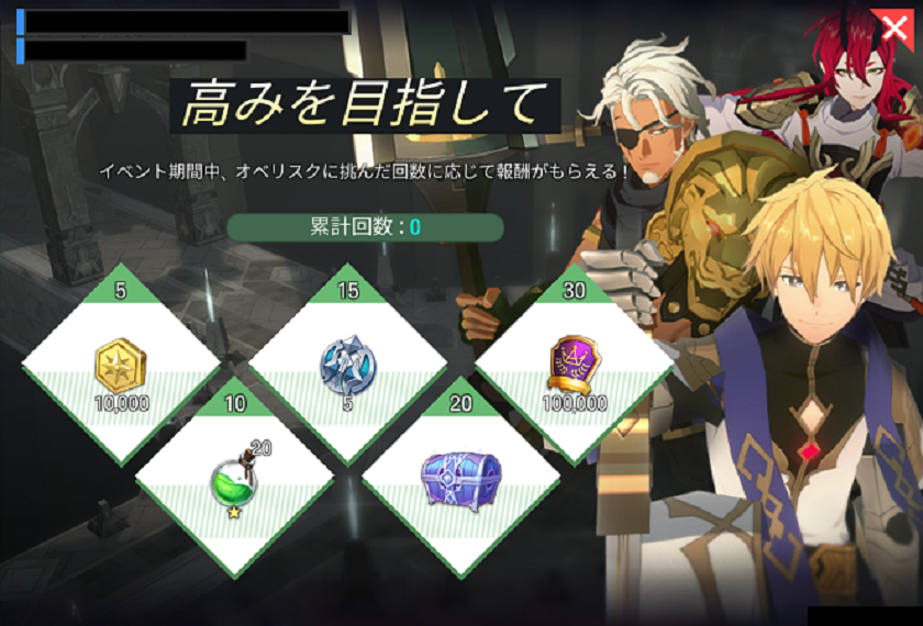- イベント期間中、オベリスクに挑んだ回数に応じて報酬を獲得できます。
