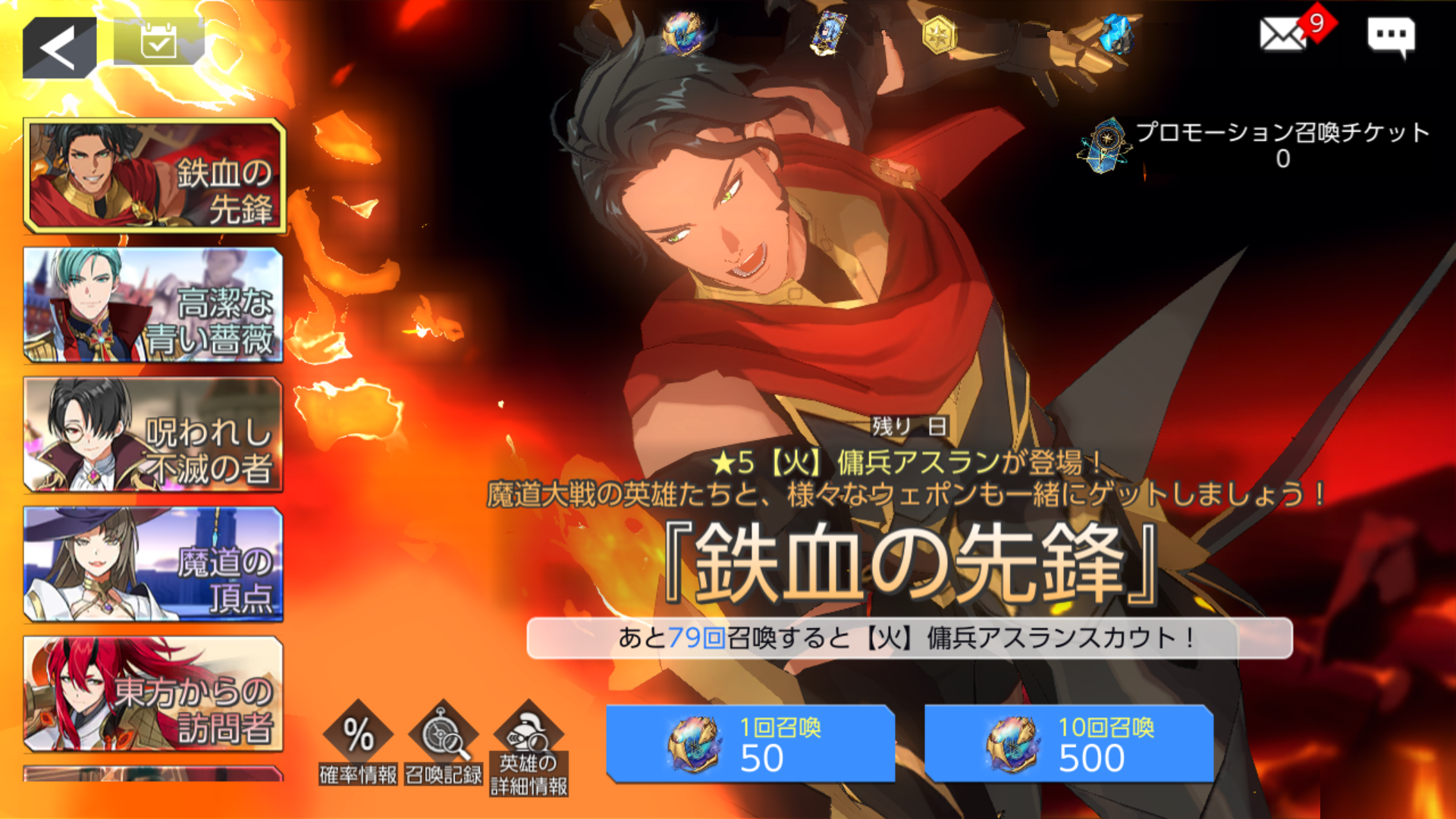 ※ 「鉄血の先鋒」召喚で89回以上★5【火】傭兵アスランが登場しない場合、90回目の召喚で★5【火】傭兵アスランが100%の確率で召喚されます。